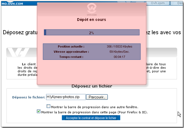 Le fichier est alors envoyé sur le serveur d'OVH. Cette étape peut prendre beaucoup de temps selon la taille de votre fichier. La progression est indiquée dans une fenêtre :